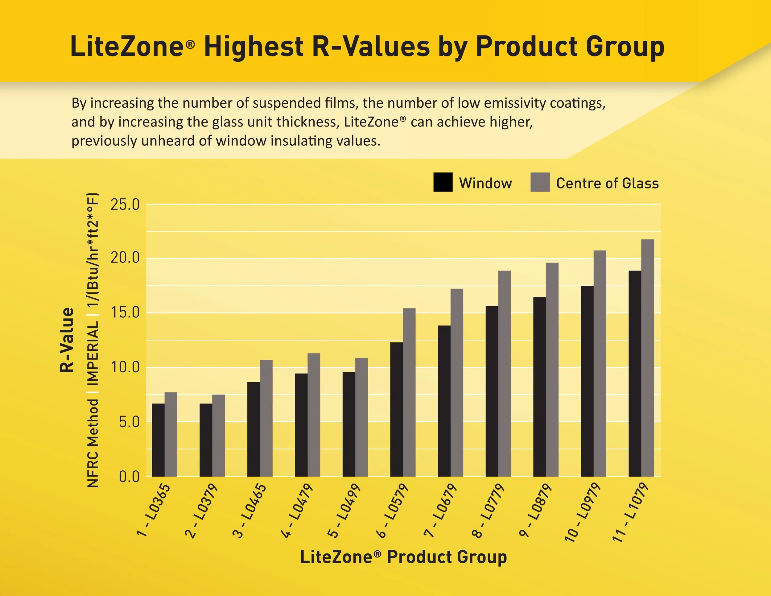 LiteZone® glass units offer insulating values from R3.1 to R22.7 (centre of glass), depending on configuration.
